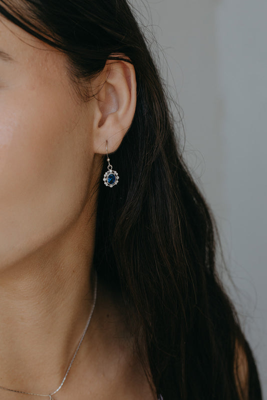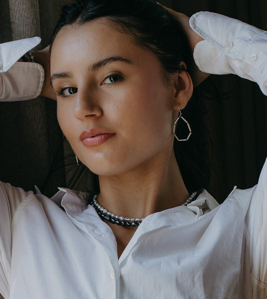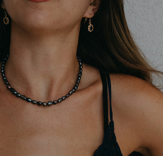 סט שרשרת ועגילים: שרשרת פנינים שחור מהסרטים ועגילי זהב כחול דרמטי