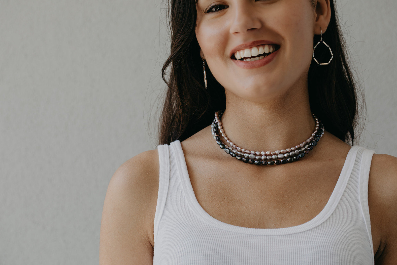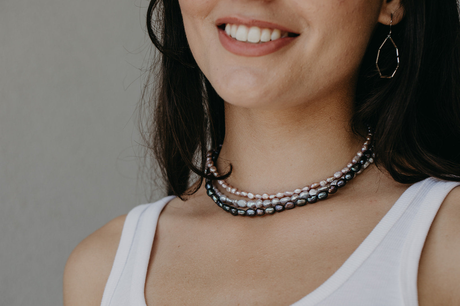 סט של 3 שרשראות פנינים מהסרטים: ורוד-סגול, אפור ושחור