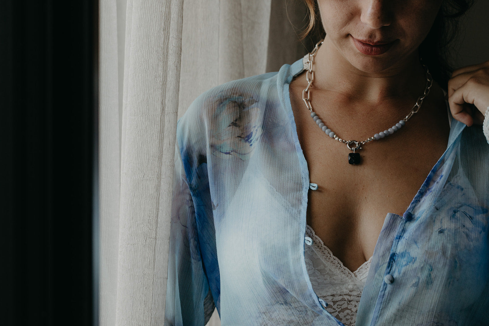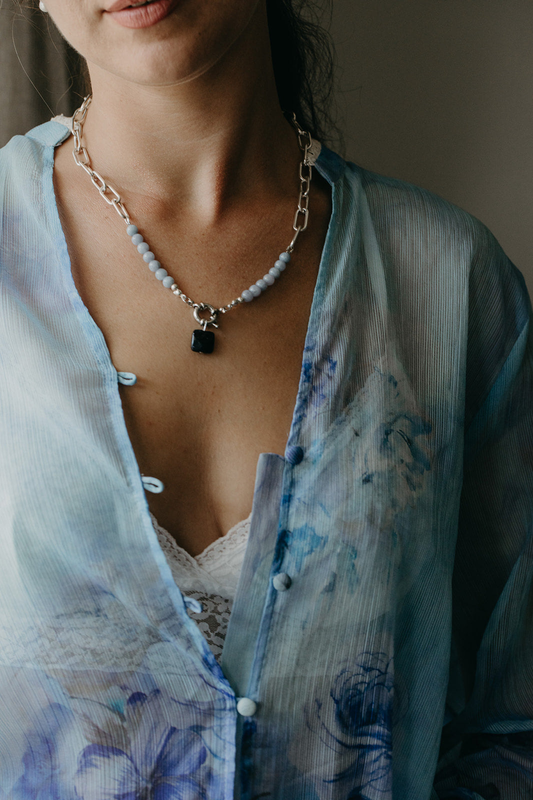 ,חומרים: השרשרת בציפוי כסף 925. חרוזים אבן טבעית בצבע כחול תכלת