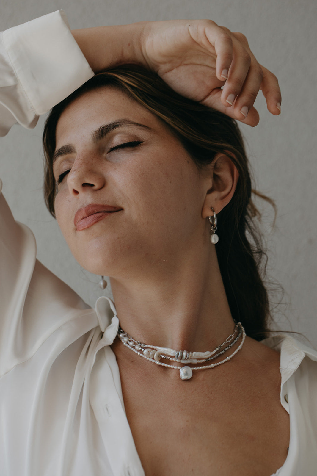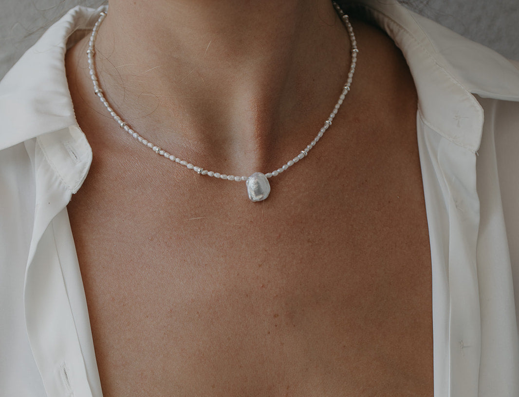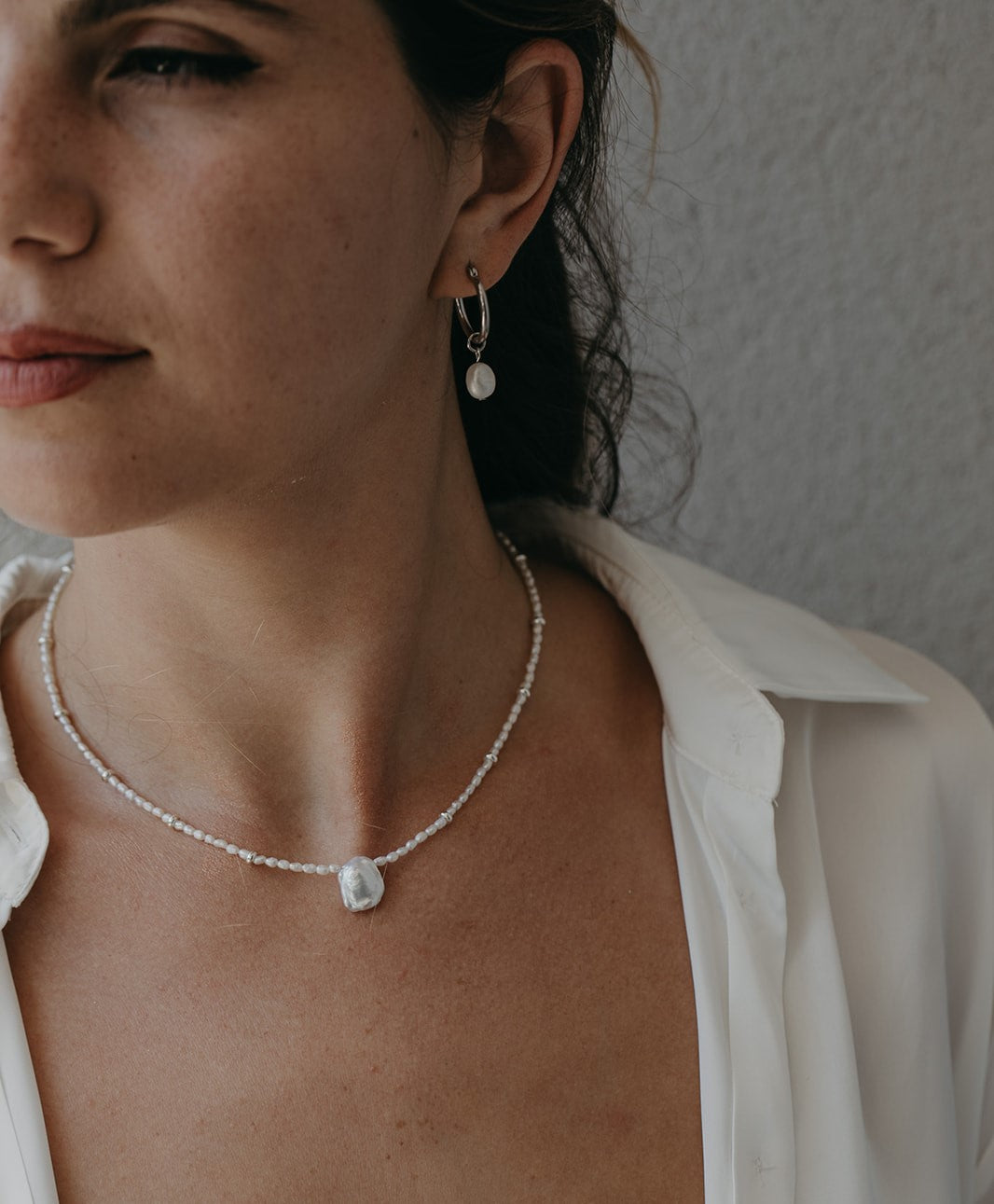 חומרים: פנינים קטנות ועדינות באיכות גבוהה, אבני כסף סטרלינג, תליון פנינה אפור בצורה ייחודית