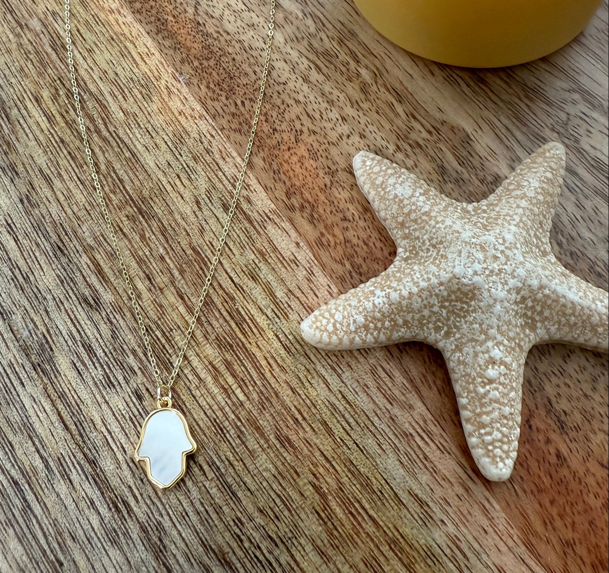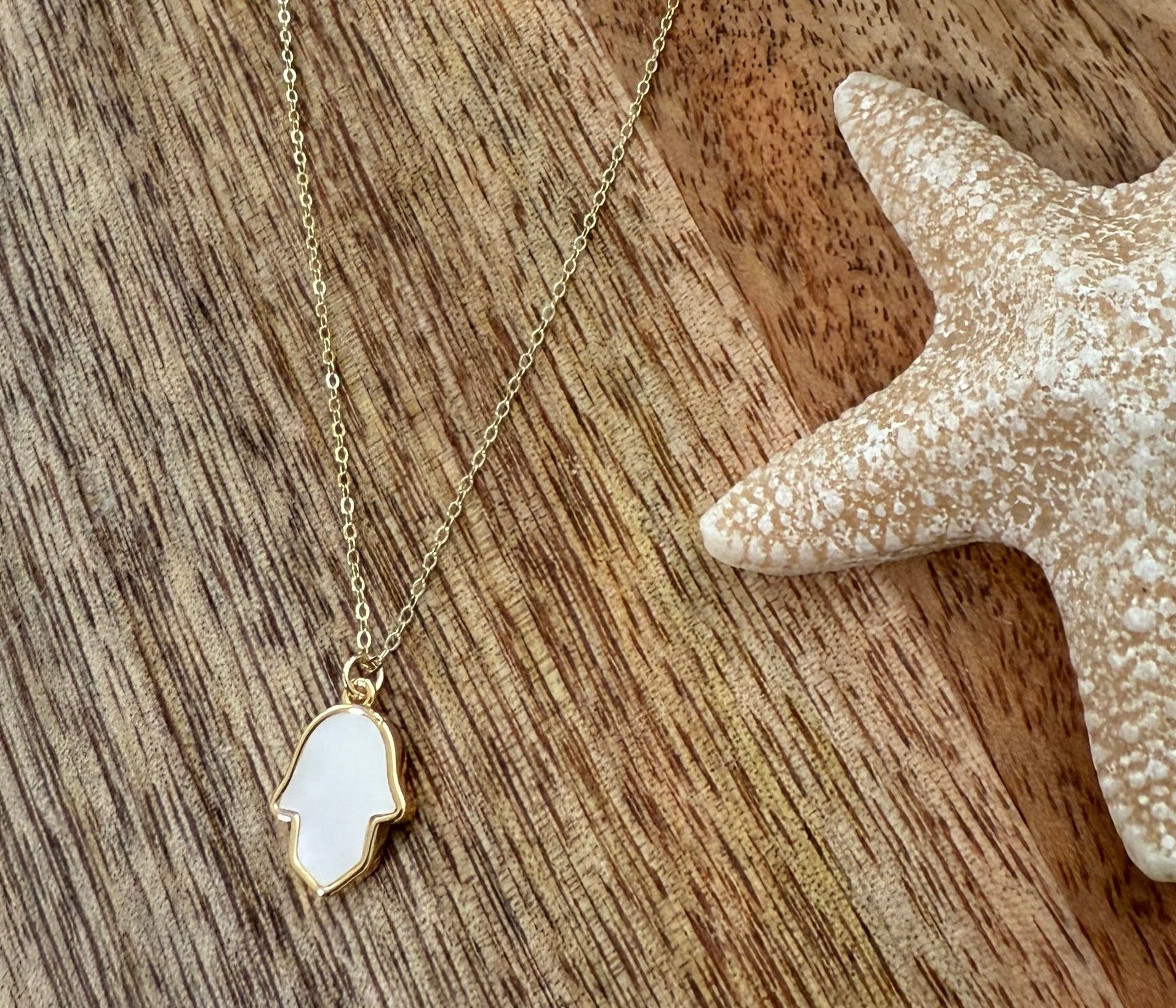 חומרים: שרשרת זהב בציפוי 14 קראט, תליון חמסה ציפוי 18 קראט שכבת פנינה