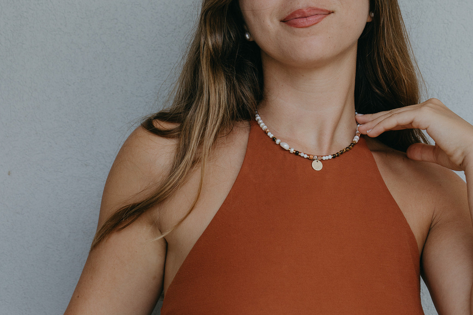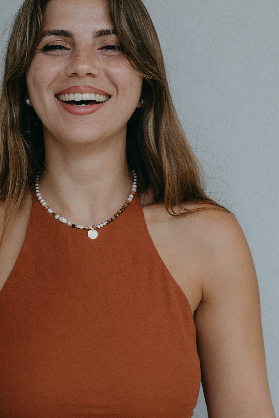 חומרים: אבן טבעית וחרוזים , פנינים טבעיות אמיתיות, תליון שטוח בציפוי זהב 14 קראט