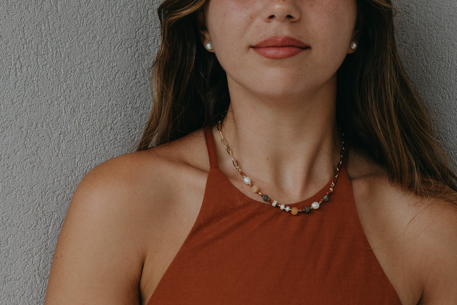 חומרים: חוליות זהב ציפוי 14 קראט, אבן אגט פרסית כתומה טבעית, אבן טבעית פיקאסו חרוזי ג'ספרס, זכוכית אוסטרית נחושת שקופה קריסטל, פנינים טבעיים אמיתיים באיכות גבוהה