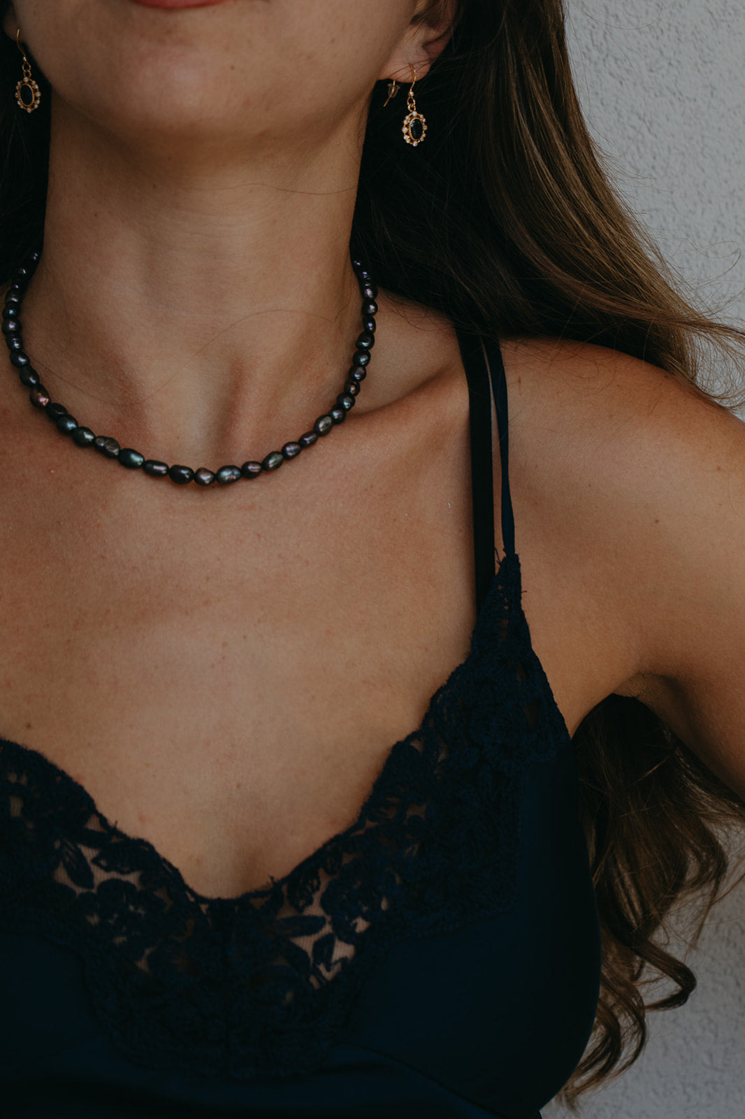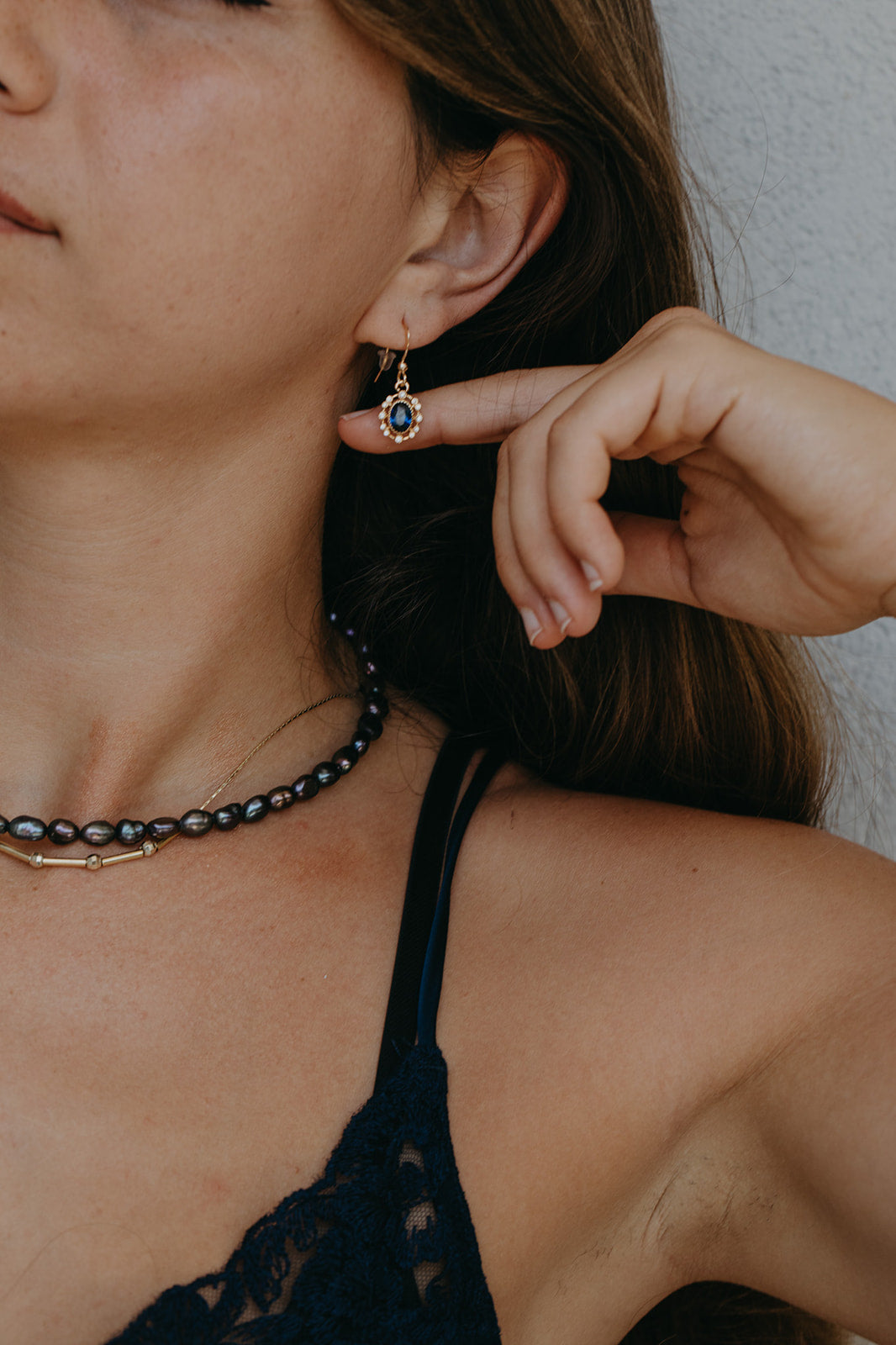 סט שרשרת ועגילים: שרשרת פנינים שחור מהסרטים ועגילי זהב כחול דרמטי