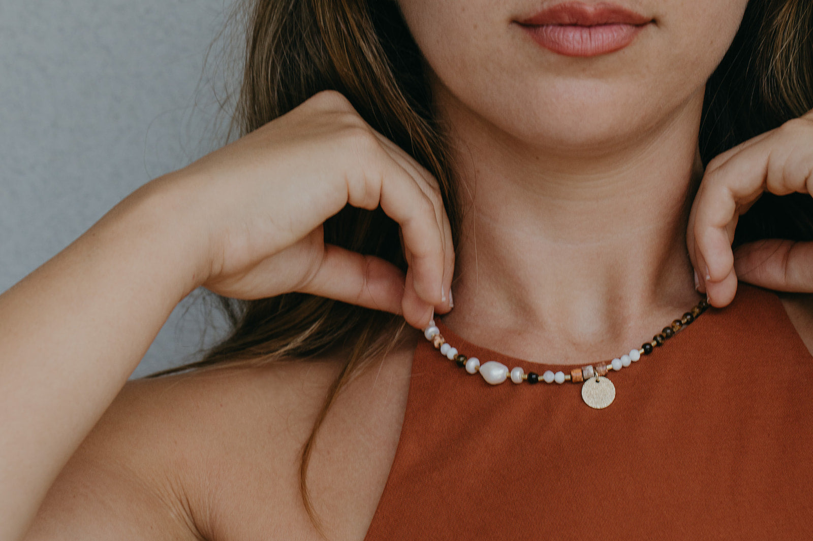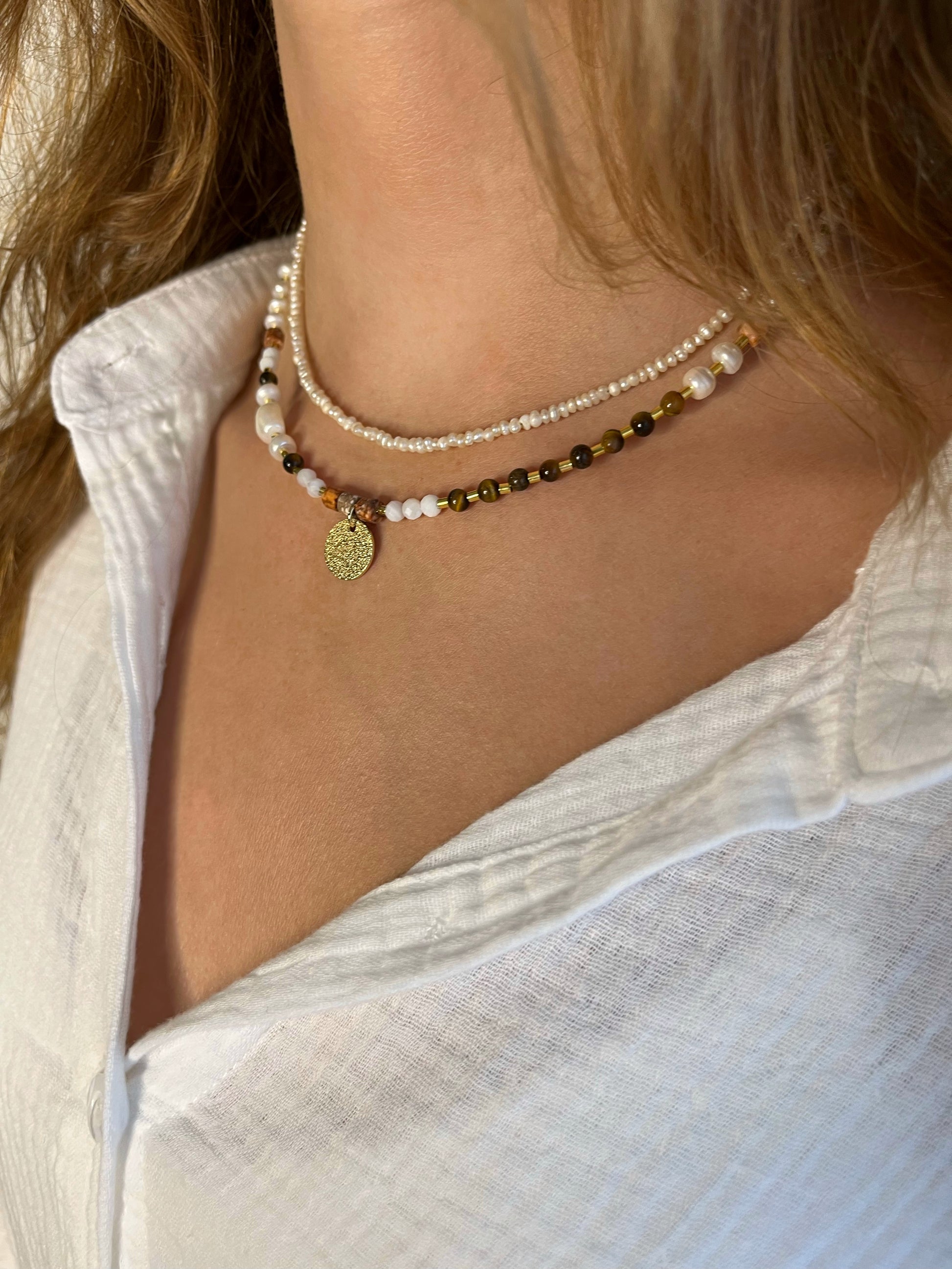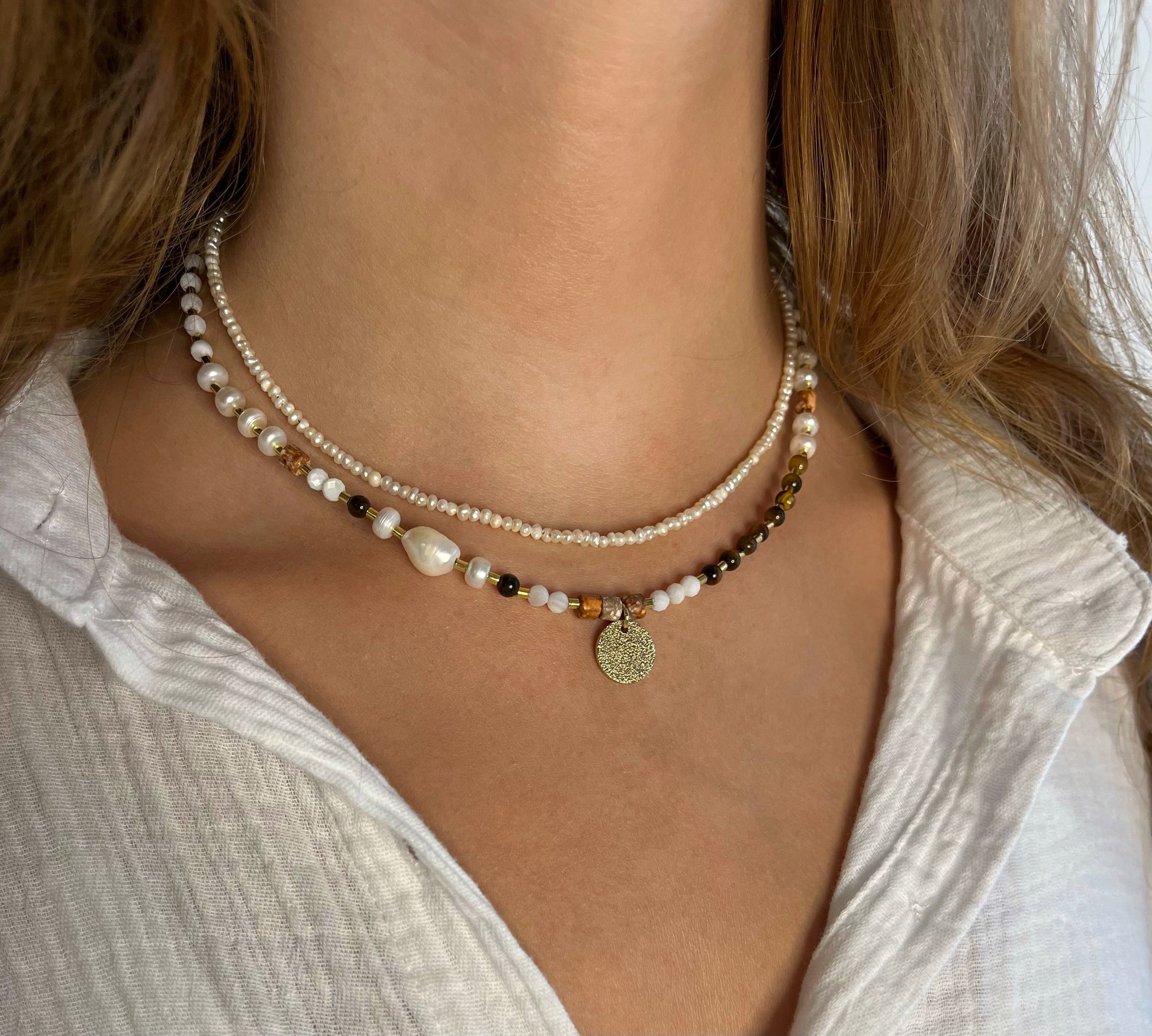 חומרים: אבן טבעית וחרוזים איכותיים, פנינים טבעיות אמיתיות, תליון שטוח בציפוי זהב 14 קראט