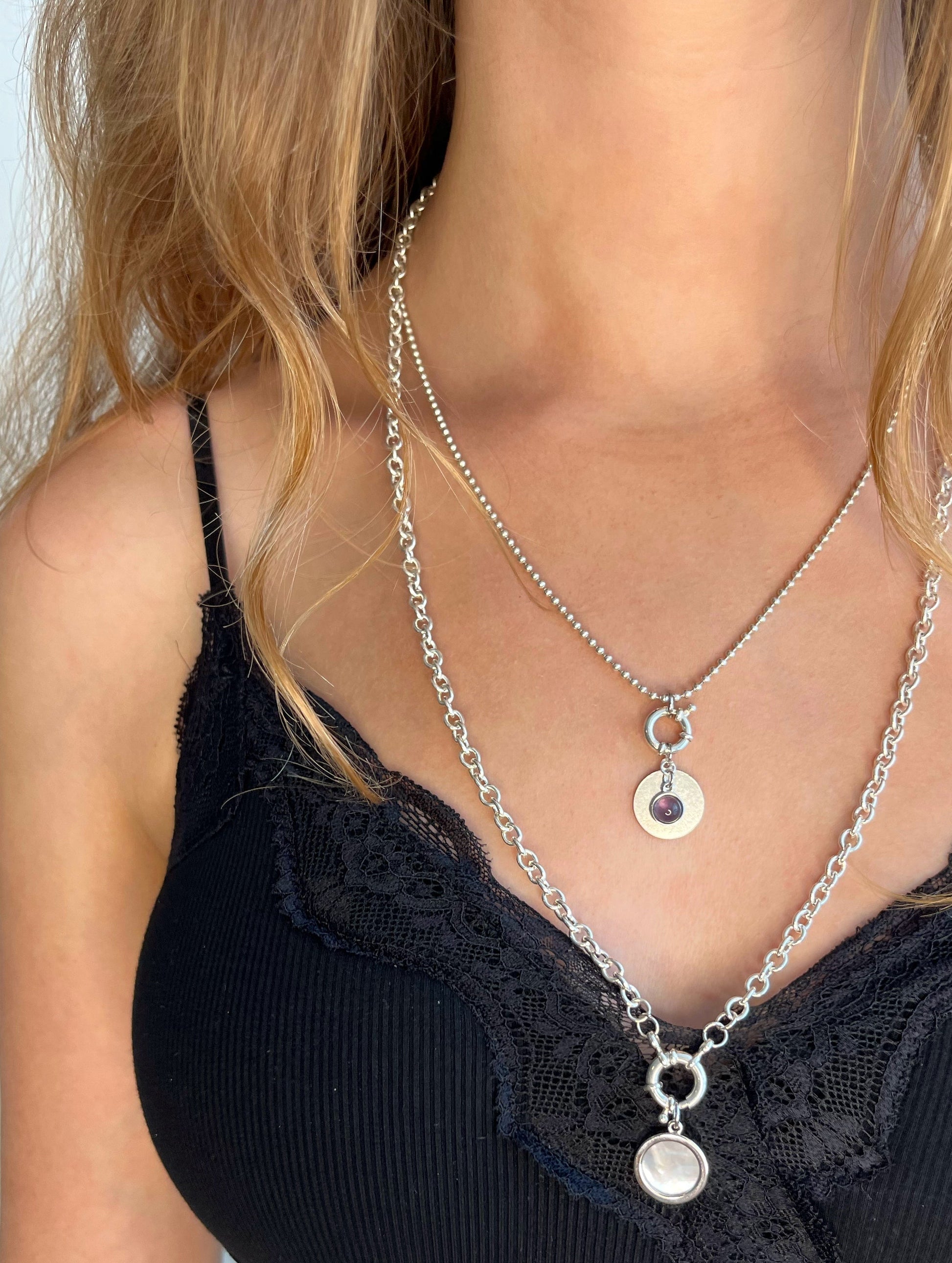 חומר שרשרת עיגולים כסף סגול: כל מרכיבי השרשרת עשויים מכסף סטרלינג 925, שרשרת כדורים, אבזם עיגול כסף , תליון עגול שטוח חלק , תליון סגול אבן אופל קריסטל